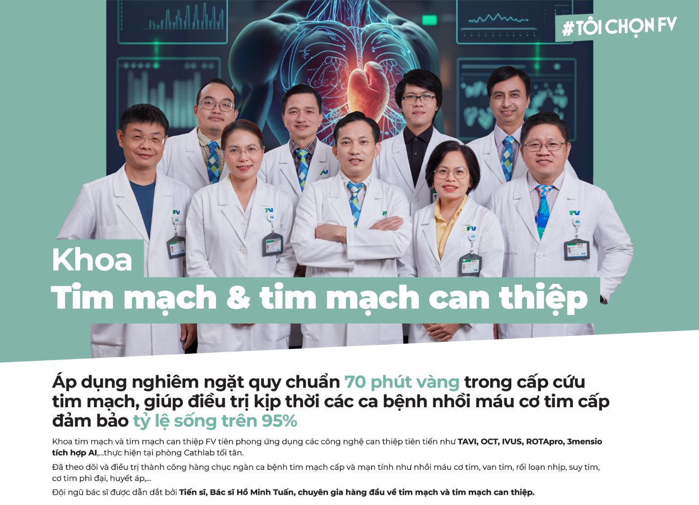 Đừng chủ quan với triệu chứng thiếu máu cơ tim, dù chỉ là đau ngực thoáng qua hay mệt mỏi bất thường. Hãy đến Khoa Tim mạch và Tim mạch can thiệp, Bệnh viện FV để được thăm khám và tầm soát tim mạch toàn diện. Đội ngũ bác sĩ chuyên môn cao, thiết bị hiện đại và quy trình chuẩn quốc tế sẽ giúp bạn phát hiện sớm nguy cơ và ngăn ngừa nhồi máu cơ tim kịp thời.