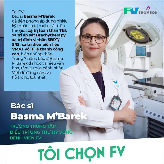 Tại Trung tâm Điều trị Ung thư Hy Vọng – Bệnh viện FV, đội ngũ bác sĩ được đào tạo bài bản và từng công tác tại nhiều trung tâm ung bướu danh tiếng ở châu Âu. Dẫn đầu là Tiến sĩ, Bác sĩ Basma M’Barek, chuyên gia với hơn 18 năm kinh nghiệm làm việc tại Pháp, hiện là Trưởng Trung tâm Điều trị Ung thư Hy vọng.