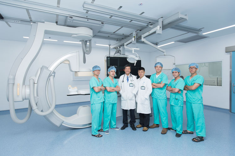 Bác sĩ Huỳnh Ngọc Long (thứ 3 từ trái sang) cùng ê kíp tại phòng Cathlab