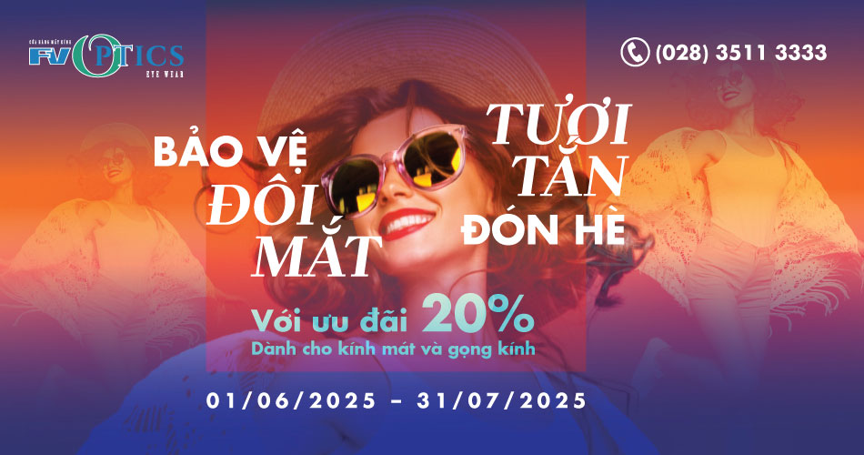 Mùa hè này, hãy để FV Optics đồng hành cùng bạn trên hành trình tìm kiếm vẻ đẹp và sự bảo vệ hoàn hảo cho đôi mắt. Từ ngày 01/06/2025 – 31/07/2025, cửa hàng mắt kính FV dành tặng bạn ưu đãi 20% cho tất cả các dòng kính mát và gọng kính cao cấp để bạn tự tin đón hè rực rỡ.