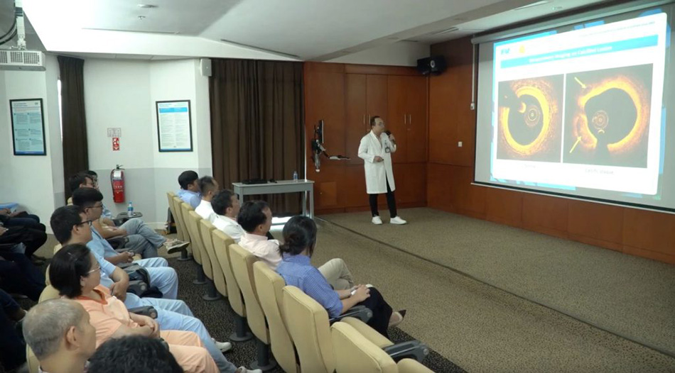 Phần được mong đợi nhất chính là đào tạo trực tiếp tại phòng Cathlab. Dưới sự dẫn dắt của TS.BS. Hồ Minh Tuấn – Trưởng khoa Tim mạch và Tim mạch can thiệp FV, các bác sĩ Sóc Trăng đã theo dõi ba ca bệnh khó: Một nhà sư 57 tuổi bị đau ngực kéo dài, phát hiện hẹp vôi hóa nặng động mạch vành và chuyển đến bệnh viện FV để can thiệp; một bác sĩ Việt kiều Đức 70 tuổi, tái hẹp vôi hóa nặng trong stent cũ đặt cách đây 10 năm tại Đức; một phụ nữ 69 tuổi với tổn thương vôi hóa thân chung trái – “cửa ải” khó nhất trong can thiệp tim mạch.
