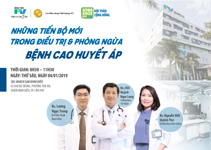 Bệnh viện FV tổ chức hội thảo miễn phí với chủ đề “Những tiến bộ mới trong điều trị và phòng ngừa bệnh cao huyết áp” với sự góp mặt của các bác sĩ cấp cao đang công tác tại FV: bác sĩ Huỳnh Ngọc Long – Trưởng khoa tim mạch Bệnh viện FV, là một trong những bác sĩ hàng đầu Việt Nam về can thiệp tim mach; bác sĩ Lương Ngọc Trung – bác sĩ Phẫu thuật mạch máu; và bác sĩ Nguyễn Viết Quỳnh Thư – Trưởng khoa Dinh dưỡng Bệnh viện FV.