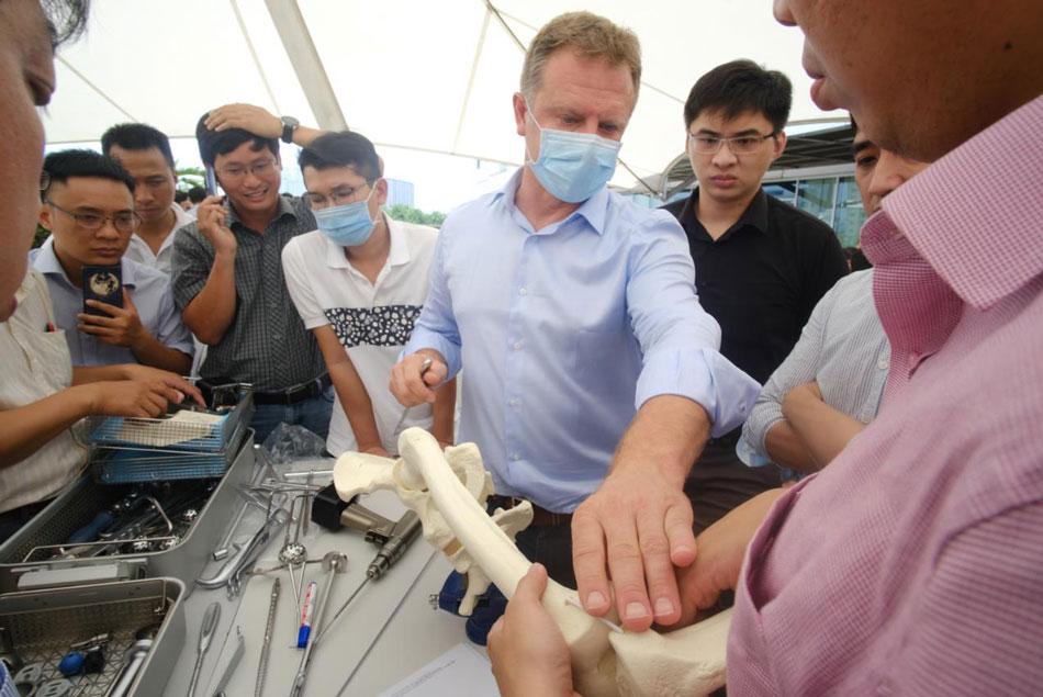 Chuyên gia đào tạo của MicroPort đang hướng dẫn sử dụng bộ thiết bị chuyên dụng cho kỹ thuật thay khớp háng với đường mổ SuperPath