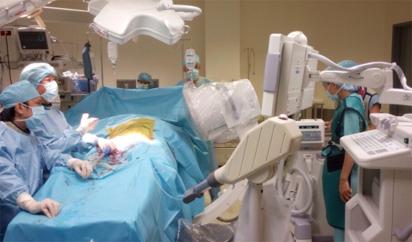 Sau khi chụp động mạch chủ ngực của bệnh nhân H.A, các bác sĩ của Bệnh viện FV đã tiến hành bộc lộ động mạch đùi trái sau đó đưa stent graft qua vết rạch động mạch đùi trái lên động mạch chủ ngực, đặt ở vị trí trên động mạch thân tạng. Vói sự hỗ trợ của máy C-Arm, bác sĩ xác định chính xác vị trí của túi phình để đặt stent graft đúng chỗ. Khi stent được đặt đúng vị trí, stent graft được mở theo đúng kích thước thực của nó. Tuỳ thuộc vào hình thái và kích thước tổn thương có thể đặt một, hai hoặc ba stent graft. Thả stent graft, chụp kiểm tra lại, động mạch thân tạng không bị chèn ép, rút toàn bộ hệ thống, hoàn tất quá trình đặt stent graft. Lúc này, dụng cụ sẽ có tác dụng như một hàng rào vững chắc bảo vệ thành động mạch chủ, giảm nguy cơ bị vỡ động mạch chủ.