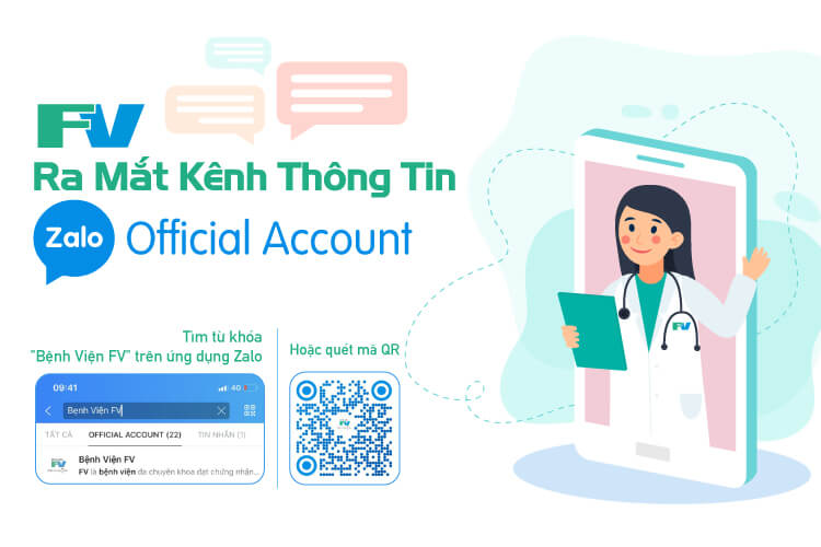 Bệnh viện FV vừa cho ra mắt kênh thông tin Official Account “Bệnh Viện FV” trên nền tảng mạng xã hội Zalo, hoạt động song song với các kênh truyền thống khác như website www.fvhospital.com, Facebook fanpage và Tổng đài (028) 35 11 33 33. Chỉ cần nhấn “Quan tâm” kênh Zalo chính thức có tên “Bệnh Viện FV”, Quý khách hàng có thể cập nhật các tin tức, sự kiện và các chương trình ưu đãi từ FV. Đồng thời, Quý khách có thể dễ dàng đặt lịch khám và tương tác với Bệnh viện FV bằng cách gửi tin nhắn trực tiếp trên ứng dụng Zalo.