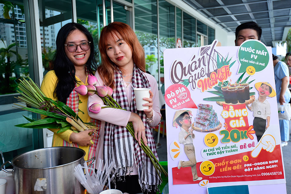 Mở đầu là hội chợ ẩm thực lần đầu tiên được tổ chức trong khuôn khổ của sự kiện thường niên này tại FV. Hội chợ đã diễn ra nhộn nhịp và sôi nổi với tấp nập người bán. Các gian hàng được bày trí từ 11h – 15h với nhiều món ăn hấp dẫn, thơm ngon, hợp vệ sinh và đầy đủ dinh dưỡng như: bò pía, bánh trung thu, bánh tráng trộn, trà sữa, sữa chua, bánh Takoyaki, trà trái cây, bánh dân gian… đã thu hút rất nhiều khách hàng là nhân viên lẫn thân nhân đến tham quan, mua sắm.