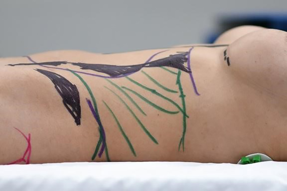 Tại phòng mổ, bác sĩ Daniel vẽ lại những vị trí sẽ hút, tạo hình trên cơ thể chị Thu. Phần vẽ màu xanh lục sẽ là nơi mỡ được hút ra, phần vẽ màu đen là vị trí bác sĩ Daniel dùng que hút một lượng mỡ rất nhỏ, đủ tạo một đường rãnh bụng.