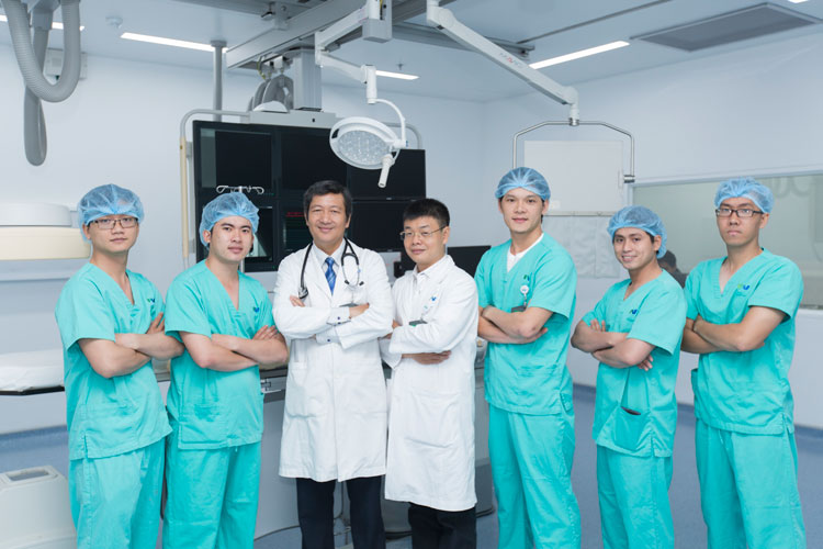 Bác sĩ Huỳnh Ngọc Long – Trưởng khoa Tim mạch bệnh viện FV (thứ 3 từ trái sang) cùng ê kíp tại phòng Cathlab