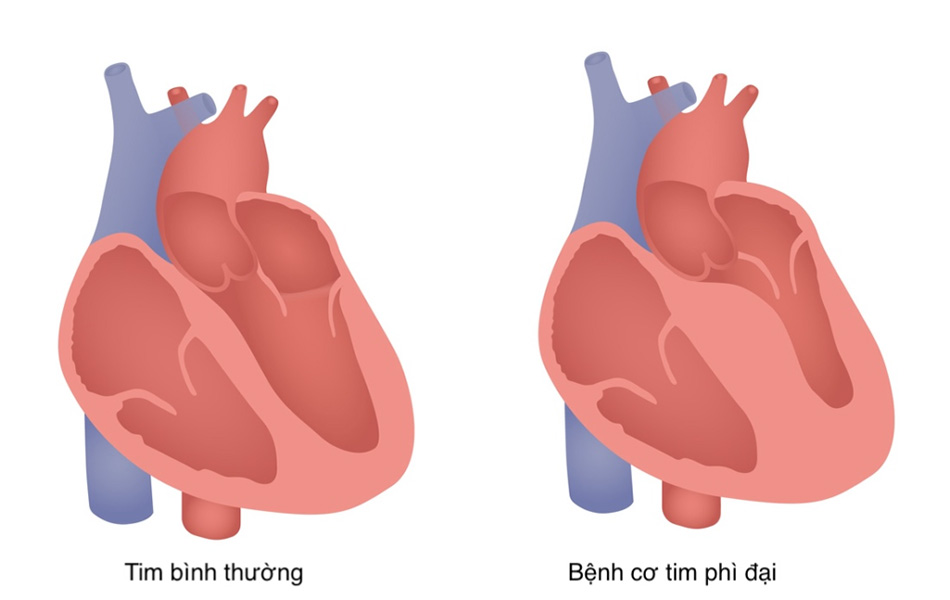 Hình minh họa trái tim bình thường (trái) và trái tim bị bệnh cơ tim phì đại (phải) với thành tim dày lên