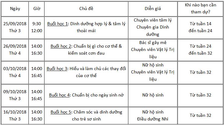 Chương trình bao gồm 05 buổi học kéo dài trong suốt thai kỳ.