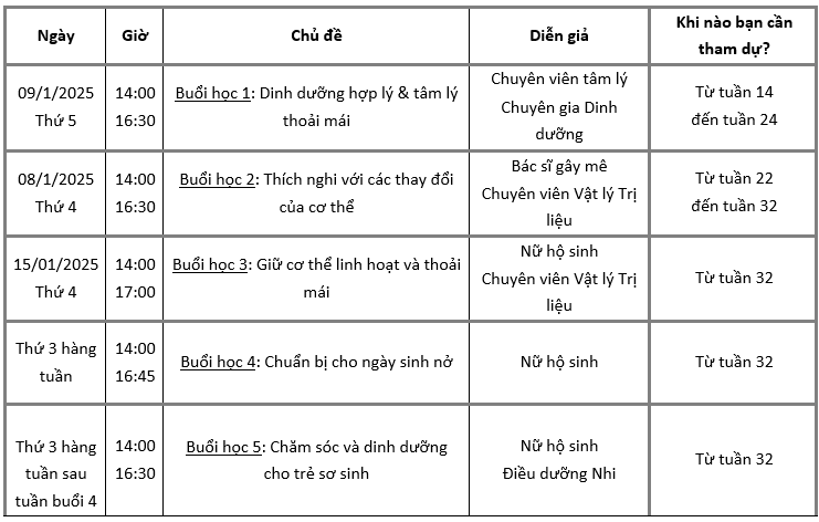 Toàn bộ chương trình bao gồm 5 buổi học nhằm hướng dẫn bạn chuẩn bị cho tất cả các giai đoạn của thai kỳ, giúp bạn có được trải nghiệm làm mẹ tốt nhất.