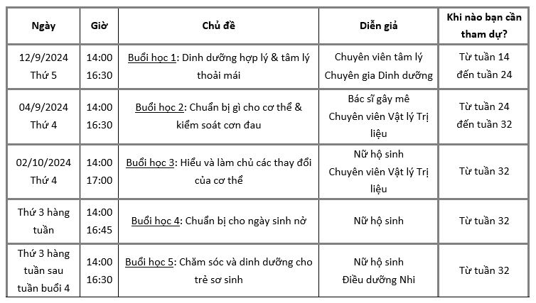 Toàn bộ chương trình bao gồm 5 buổi học nhằm hướng dẫn bạn chuẩn bị cho tất cả các giai đoạn của thai kỳ, giúp bạn có được trải nghiệm làm mẹ tốt nhất.