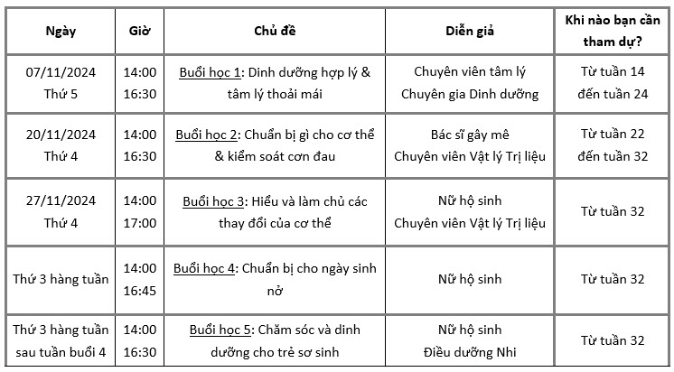 Toàn bộ chương trình bao gồm 5 buổi học nhằm hướng dẫn bạn chuẩn bị cho tất cả các giai đoạn của thai kỳ, giúp bạn có được trải nghiệm làm mẹ tốt nhất.