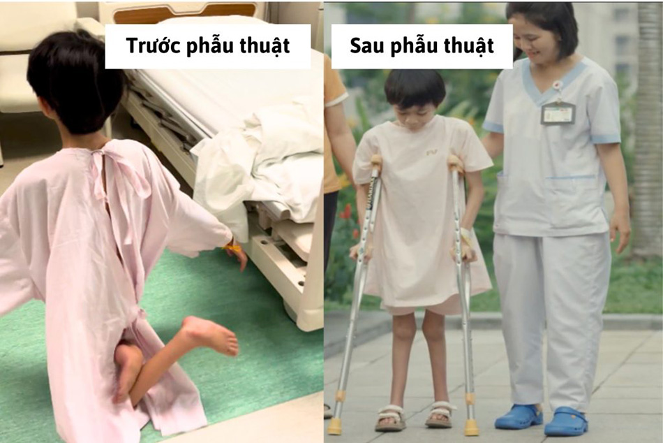 Bé Trang trước phẫu thuật chỉ di chuyển bằng đầu gối và đã có thể tập đi bằng đôi chân mình sau phẫu thuật, và tương lai có thể bước đi bình thường không cần chống nạng