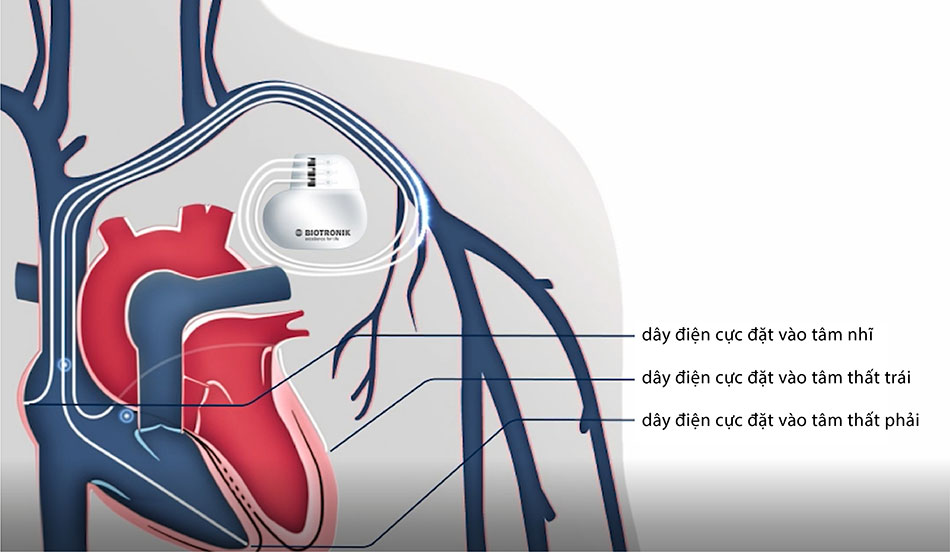 Theo đó, máy có 3 dây dẫn truyền, gồm 2 dây dẫn điện tạo nhịp được nối từ máy đến tâm thất trái và tâm thất phải; một dây nhận cảm kết nối với tâm nhĩ để nhận tín hiệu nhịp do tim tạo ra. Dây nhận cảm khi nhận được tín hiệu sẽ báo về máy, kế đến máy sẽ dẫn truyền về 2 tâm thất để tạo nhịp đập, sao cho thời gian giữa nhịp tim tự nhiên và nhịp do máy CRT tạo ra cách nhau đúng 40ms (0.04 giây). Điều này tạo ra sự đồng bộ với nhịp tim hiện tại của bệnh nhân, hỗ trợ tim có được tần số nhịp phù hợp nhất với tình trạng tim đang suy yếu của ông T.