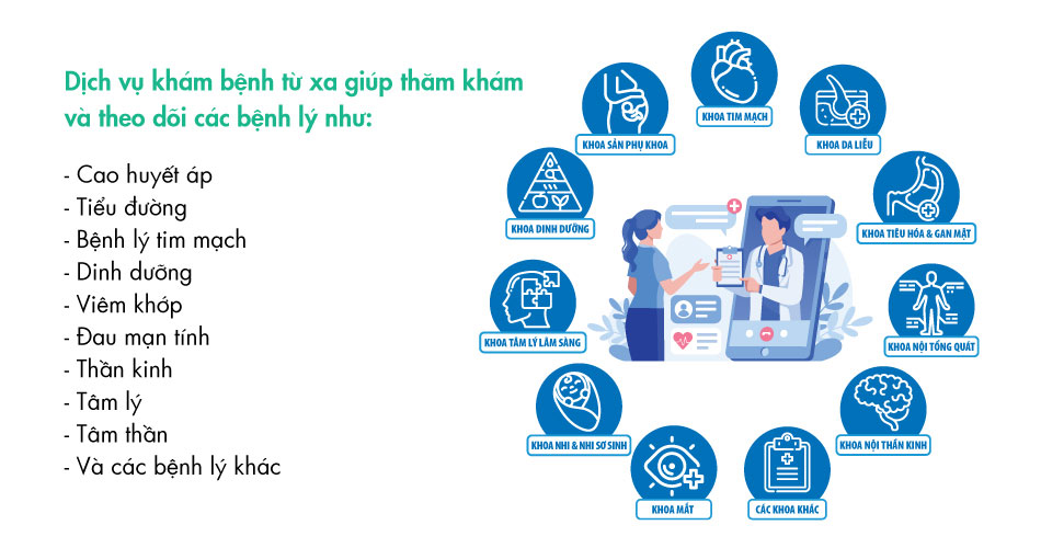 Dịch vụ Khám bệnh Từ xa giúp người bệnh có thể chăm sóc sức khỏe kịp thời, theo dõi diễn biến bệnh lý mạn tính với ưu điểm tiết kiệm thời gian và chi phí đi lại.