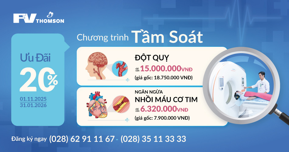 Đồng hành cùng tất cả bệnh nhân trên hành trình chủ động chăm sóc sức khỏe, Bệnh viện FV mang đến Chương trình ưu đãi lên đến 20% từ 01/11/2025 – 31/01/2026, nhằm hỗ trợ cộng đồng dễ dàng tiếp cận với quy trình tầm soát đột quỵ & nhồi máu cơ tim chuẩn quốc tế.