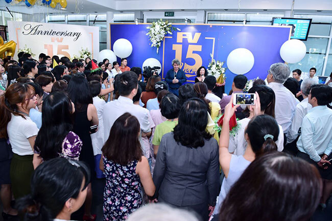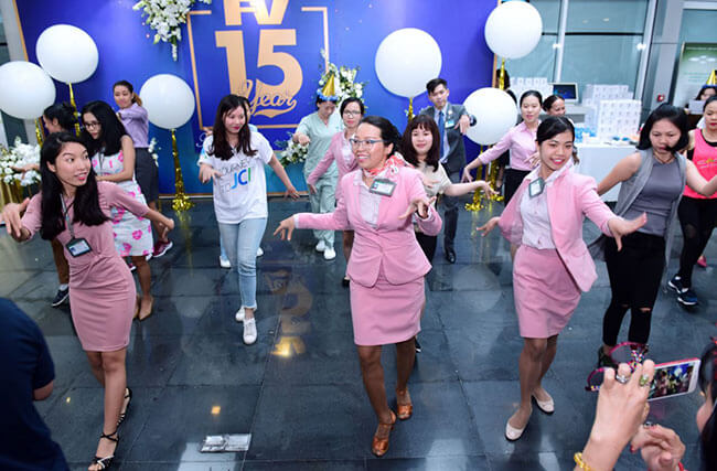Sau hơn 15 năm nỗ lực và phấn đấu không ngừng nghỉ, bệnh viện FV đã dần khẳng định mình, trở thành một trong những bệnh viện hàng đầu Việt Nam đạt chuẩn Quốc tế. Trong không khí vui tươi hào hứng, tập thể nhân viên các phòng ban đã góp vui bằng tiết mục nhảy Flash mob vô cùng sôi động. Và giây phút tuyệt vời nhất của buổi lễ cũng đến, trong tiếng vỗ tay rộn rã và bài hát “Happy birthday”, Tổng giám đốc, Bác sĩ Jean – Marcel Guillon đã xúc động gửi lời cảm ơn đến các nhân viên. Sau nghi thức cắt bánh sinh nhật, các thành viên đã cùng thưởng thức bánh ngọt và giao lưu chuyện trò vui vẻ.