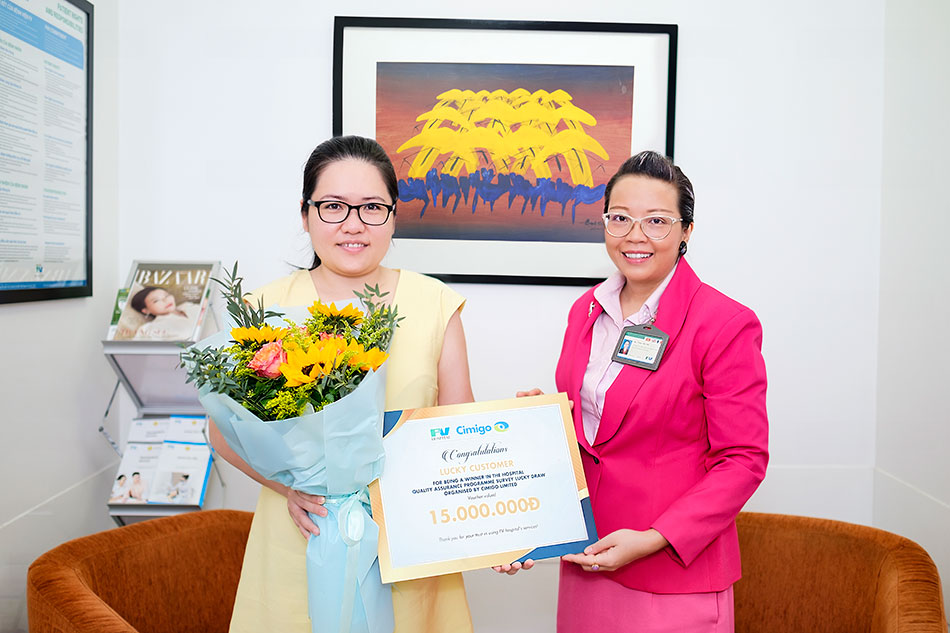 Giải thưởng từ Chương trình Khảo sát Chất lượng Dịch vụ Bệnh viện FV đã tìm được khách hàng may mắn cuối cùng trong năm 2022. Chị Nguyễn Quế Anh (34 tuổi, Tp.HCM) đã đến nhận thưởng tại Phòng Chăm sóc Khách hàng, trong những ngày kề cận Xuân Quý Mão.