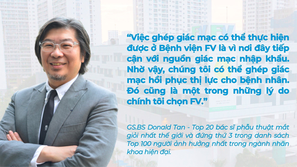 Dù nhận được nhiều lời mời hợp tác song tại Việt Nam, Bệnh viện FV là đơn vị duy nhất bác sĩ Donald Tan chọn làm nơi ghép giác mạc cho bệnh nhân. Ông cho biết, FV hội tụ những điều kiện cần và đủ theo đúng tiêu chuẩn y tế quốc tế để các ca ghép giác mạc thành công.