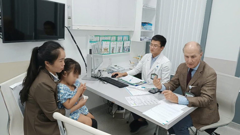 Bé Nhi và mẹ tái khám với Giáo sư McKay McKinnon (phải) sau phẫu thuật cuối năm 2023