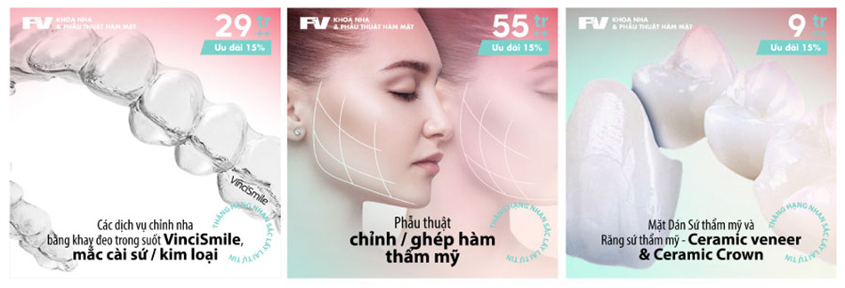 - Ưu đãi 15% cho các dịch vụ chỉnh nha (bằng mắc cài sứ, mắc cài kim loại và khay đeo trong suốt VinciSmile – không áp dụng khuyến mãi cho Invisalign Braces và Lingual Braces), phẫu thuật chỉnh hàm thẩm mỹ, cấy ghép nha khoa – implants, mặt dán sứ thẩm mỹ và răng sứ thẩm mỹ.