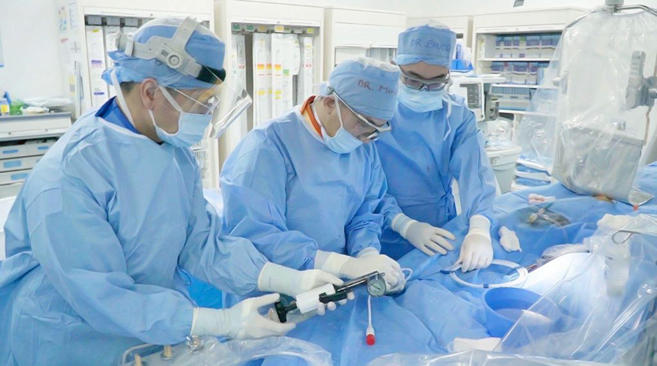 TS.BS Hồ Minh Tuấn (giữa) thực hiện can thiệp mạch vành bằng công nghệ IVL