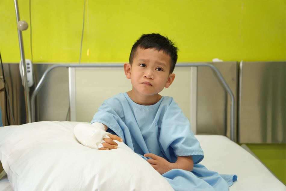 Bé Duy Quang sau khi được phẫu thuật tay phải, đặt bộ khung để kéo xương