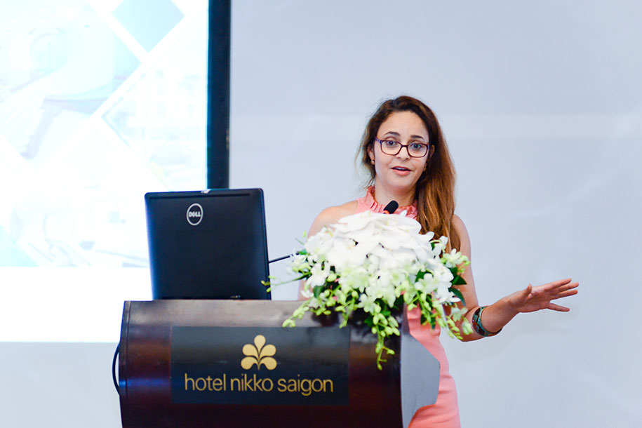 Tham dự buổi hội thảo, Bác sĩ Basma M’Barek – Trung tâm điều trị ung thư Hy Vọng Bệnh viện FV đã đưa ra những kinh nghiệm của mình về chủ đề “Tối ưu hóa khi dùng thuốc Osimertinib trong điều trị ung thư phổi không tế bào nhỏ NSCLC & chia sẻ các ca điều trị”. Phần trình bày của Bác sĩ Basma lấy tư liệu từ các ca bệnh thực tế đã điều trị thành công tại Trung tâm điều trị ung thư Hy Vọng đã đem đến sự hào hứng cho cả khán phòng. Các khách mời đã liên tục đặt câu hỏi để nhận được tư vấn và chia sẻ sâu hơn từ các bước chẩn đoán đến điều trị. Trong phần tọa đàm sau đó, Bác sĩ Basma M’Barek đã cùng với các diễn giả là giáo sư, tiến sĩ, bác sĩ đầu ngành về ung thư và phổi để thảo luận và trả lời thắc mắc của các khách mời tham dự.