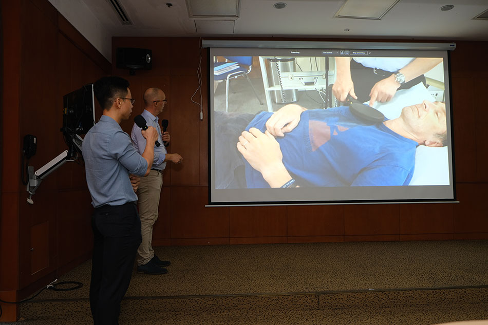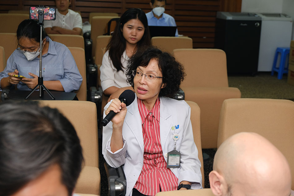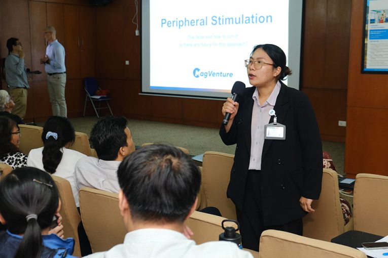 Tiếp nối phần nội dung của BS. Louis Brasseur, BS.CKI. Nguyễn Nam Bình (Chuyên gia Kiểm soát Cơn đau, Bệnh viện FV) đã trình bày thực tế ứng dụng rTMS điều trị cho bệnh nhân tại Trung tâm Điều trị Đau FV. Bác sĩ Nam Bình đã đi vào chi tiết các bước vận hành thiết bị, cách thức chuẩn bị bệnh nhân và các lưu ý khi thực hiện một buổi trị liệu. Bên cạnh đó, từ phía dự khán, bác sĩ Phạm Thị Thúy Nga (Chuyên gia Kiểm soát Cơn đau, Bệnh viện FV) với hơn 5 năm kinh nghiệm vận hành thiết bị rTMS trong điều trị đau, cũng giúp bổ sung nhiều kinh nghiệm hữu ích cho người tham dự.