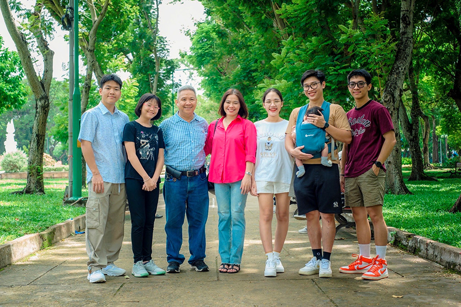 Gia đình chị Bích: 3 “em bé FV”năm xưa nay đã lớn, con đầu của chị lập gia đình và vừa đón chào thành viên mới. Ảnh: NVCC