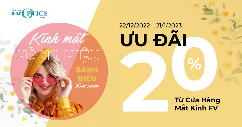 Có rất nhiều lí do để bạn tậu một chiếc kính mát mới vào dịp năm mới như: Bảo vệ mắt dưới ánh nắng gay gắt, Chống lão hóa da mắt, Chống chói lóa, đặc biệt một chiếc kính phù hợp sẽ nâng tầm phong cách giúp bạn trông cuốn hút hơn. Thay vì chọn mua nhiều loại phụ kiện khác nhau, hãy làm mới mình bằng cách đầu tư một chiếc kính hàng hiệu có mức giá vô cùng hợp lí với ưu đãi 20% tại Cửa hàng Mắt kính FV. Chương trình khuyến mãi bắt đầu từ ngày 22/12/2022 đến hết ngày 21/01/2023 áp dụng cho tất cả kính mát và gọng kính.