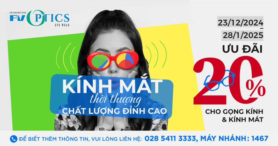 Từ 23/12/2024 – 28/1/2025, FV Optics dành tặng khách hàng ưu đãi 20% cho tất cả các mặt hàng mắt kính và gọng kính. Hãy đến tham quan, mua sắm để có thể tậu ngay cho bản thân hoặc dành tặng người thân những cặp kính đến từ các thương hiệu cao cấp, chất lượng với chi phí thật tiết kiệm. Hãy để FV Optics giúp bạn bắt đầu năm mới thật ấn tượng và bảo vệ tối ưu đôi mắt trên hành trình du xuân đây đó.