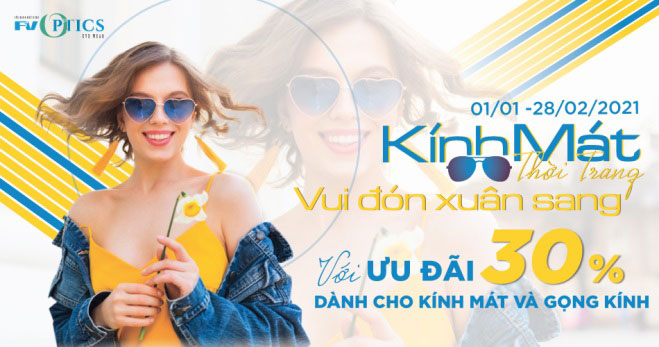 Nhà thiết kế Karl Lagerfeld đã từng nói: “Đeo kính mát cũng giống như trang điểm cho mắt. Chúng giúp mọi thứ trẻ trung và đẹp đẽ hơn”. Chẳng những thế, một chiếc kính chất lượng và an toàn sẽ giúp bảo vệ đôi mắt của bạn dưới tác hại của tia nắng mặt trời. Từ 01/01/2021 đến 28/02/2021, Cửa hàng Mắt kính FV dành tặng khách hàng ưu đãi đặc biệt lên đến 30% mức giá kính mát và gọng kính. Với chương trình này bạn có thể sở hữu những thiết kế mắt kính thời trang từ các thương hiệu nổi tiếng trên thế giới với chi phí thật tiết kiệm để thỏa sức vi vu trong dịp năm mới.