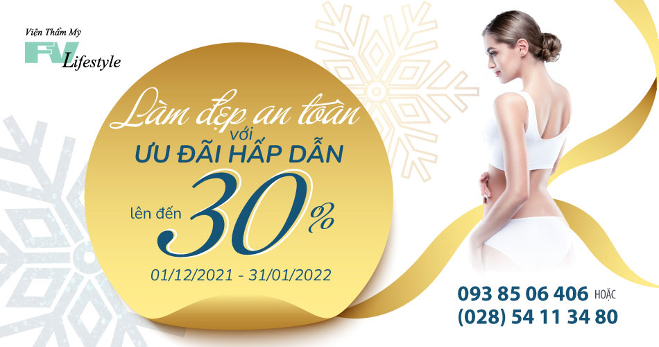 Từ ngày 01/12/2021 – 31/01/2022, Viện Thẩm mỹ FV Lifestyle dành tặng khách hàng yêu làm đẹp ưu đãi hấp dẫn lên đến 30%. Vì vậy, chẳng có lý do gì để bạn từ chối cơ hội làm đẹp cuối năm vừa tiết kiệm chi phí vừa an toàn tại FV.