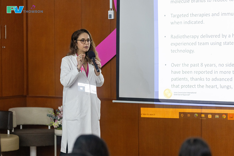 Tiếp nối, bác sĩ Basma M’Barek với hơn 25 năm kinh nghiệm trong lĩnh vực Ung thư học tại châu Âu và Việt Nam nhấn mạnh ung thư vú ngày nay không còn là bản án. Với điều trị cá nhân hóa, phối hợp đa chuyên khoa và công nghệ tiên tiến, bệnh nhân hoàn toàn có thể kiểm soát bệnh và sống khỏe mạnh. “Phát hiện sớm giúp chúng ta chữa bệnh nhẹ nhàng hơn rất nhiều. Có những bệnh nhân của tôi điều trị xong vẫn tiếp tục làm việc, chăm con và tận hưởng cuộc sống mà không ai biết họ từng mắc ung thư,” bác sĩ nói.
