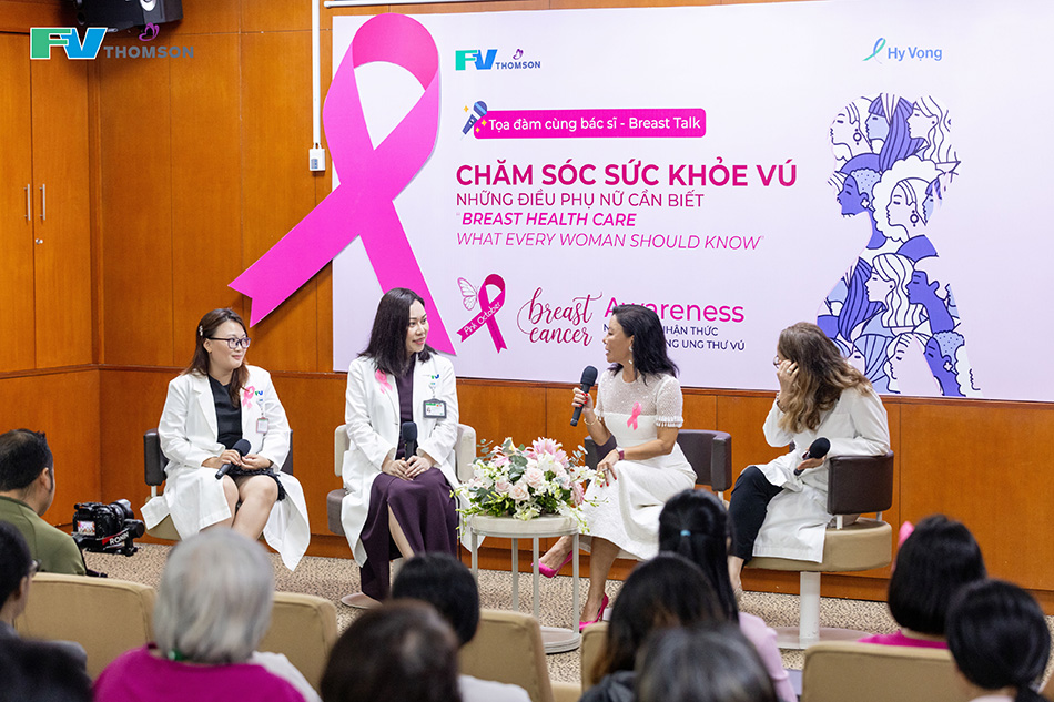 Điểm nhấn của chương trình là buổi tọa đàm “Chăm sóc sức khỏe tuyến vú – Những điều phụ nữ cần biết” với sự tham gia của ba chuyên gia hàng đầu: BSCKI Phùng Ngọc Thư – Trưởng Trung tâm Chăm sóc Sức khỏe Tuyến vú FV, BS Basma M’Barek – Trưởng Trung tâm Điều trị Ung thư Hy Vọng, và BS Võ Ngọc Tú – Phẫu thuật viên Tạo hình, Viện Thẩm mỹ FV. Trong không khí ấm áp, các bác sĩ không chỉ chia sẻ kiến thức y khoa cập nhật mà còn kể lại những câu chuyện chân thật, chạm đến trái tim người nghe.