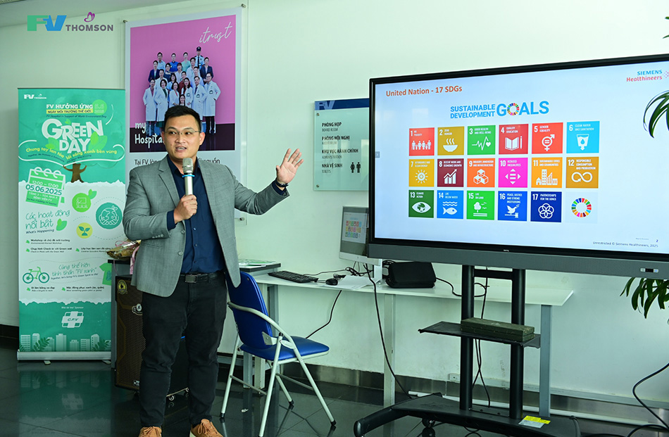 Workshop “Xanh” diễn ra từ 12:00 đến 13:00 thu hút hơn nhiều nhân viên tham dự. Các chủ đề xoay quanh thực hành bền vững trong y tế – từ hệ thống vận hành, thiết bị tiết kiệm năng lượng, đến công nghệ MRI thân thiện môi trường. Những chia sẻ đến từ chính các trưởng bộ phận tại FV và đối tác Siemens Healthineers đã gợi mở góc nhìn mới mẻ: bảo vệ môi trường không phải là điều xa xôi – mà bắt đầu ngay trong công việc mỗi ngày tại bệnh viện.