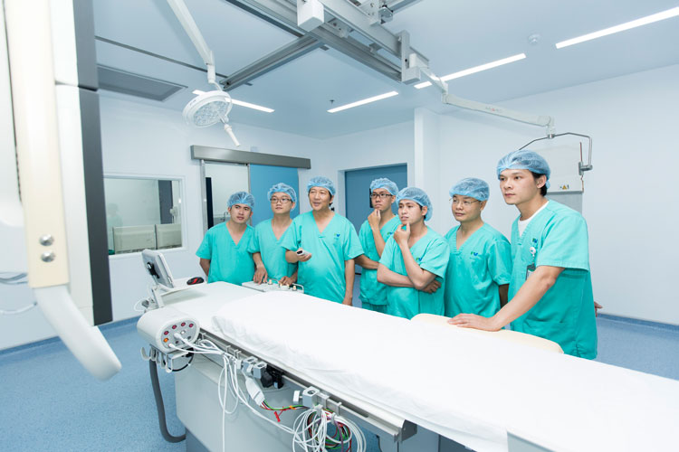 Một ê kíp đang được đào tạo cách vận hành các thiết bị của phòng Cathlab