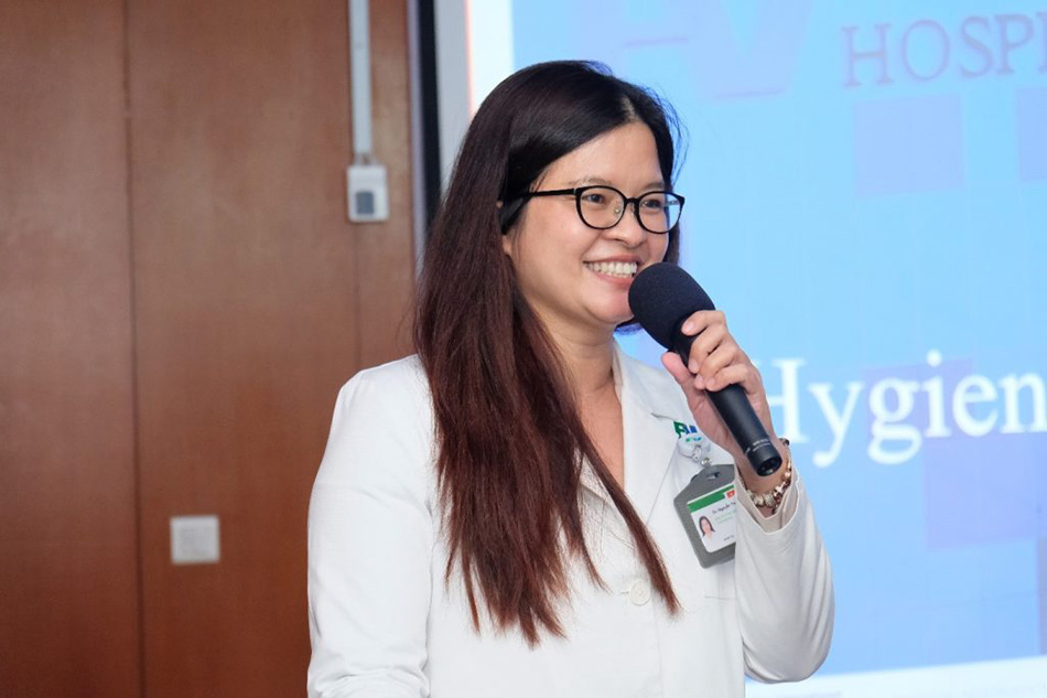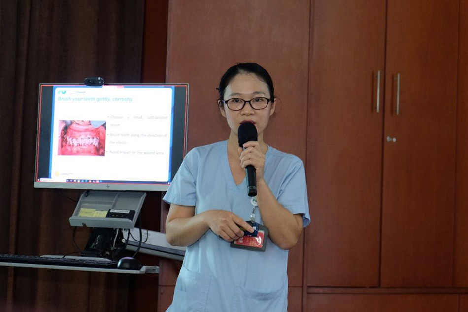 Đại diện điều dưỡng Khoa Nha & Phẫu thuật hàm mặt, chị Nguyễn Thị Hồng đã có phần chia sẻ về vai trò của điều dưỡng trong việc hỗ trợ bệnh nhân sau phẫu thuật hàm mặt. Điều dưỡng viên không chỉ đảm bảo vệ sinh răng miệng hàng ngày, mà còn theo dõi sát sao tình trạng vết thương, phát hiện sớm các biến chứng và phối hợp với bác sĩ để đưa ra các giải pháp kịp thời cho người bệnh.