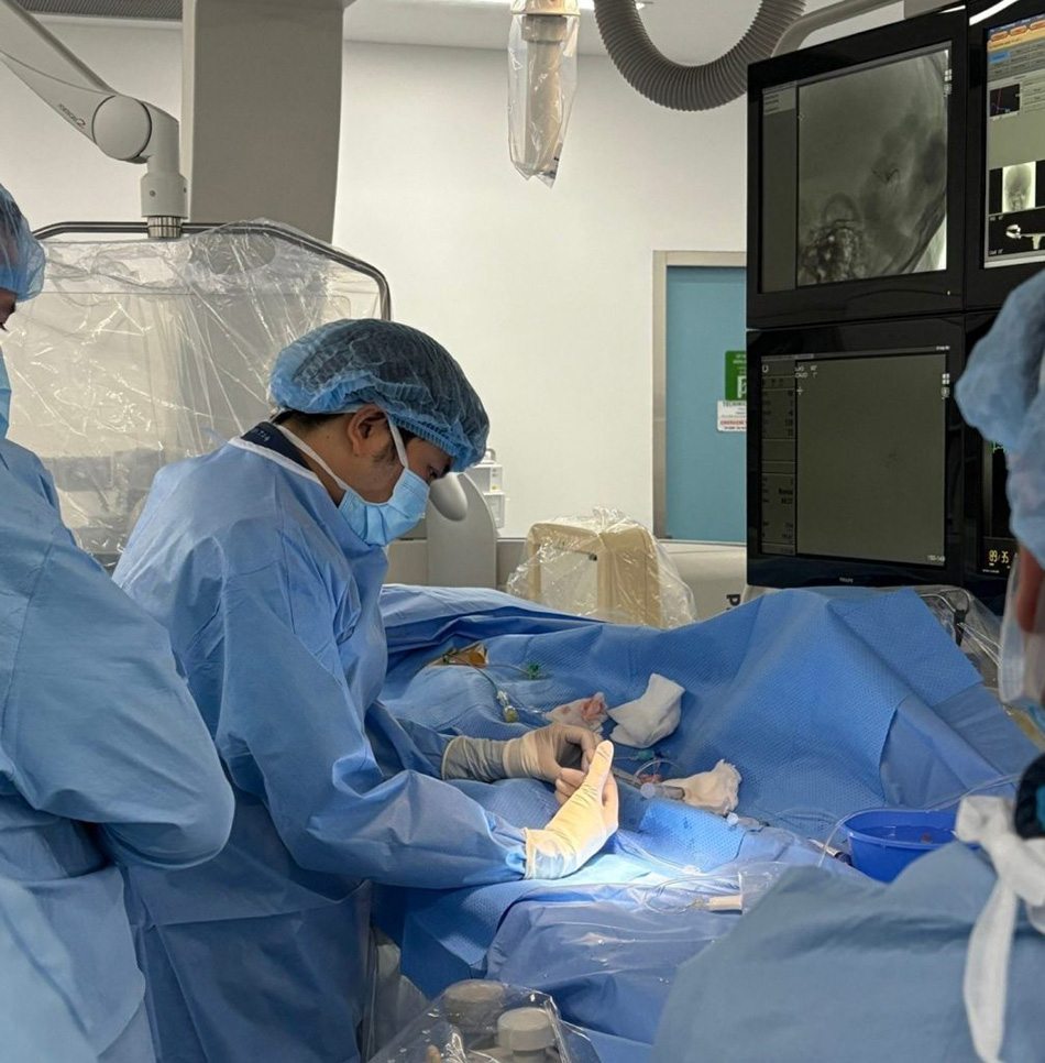 Bác sĩ Huỳnh Hữu Danh và ekip đang thực hiện kĩ thuật can thiệp mạch máu tại phòng Cath-lab bệnh viện FV