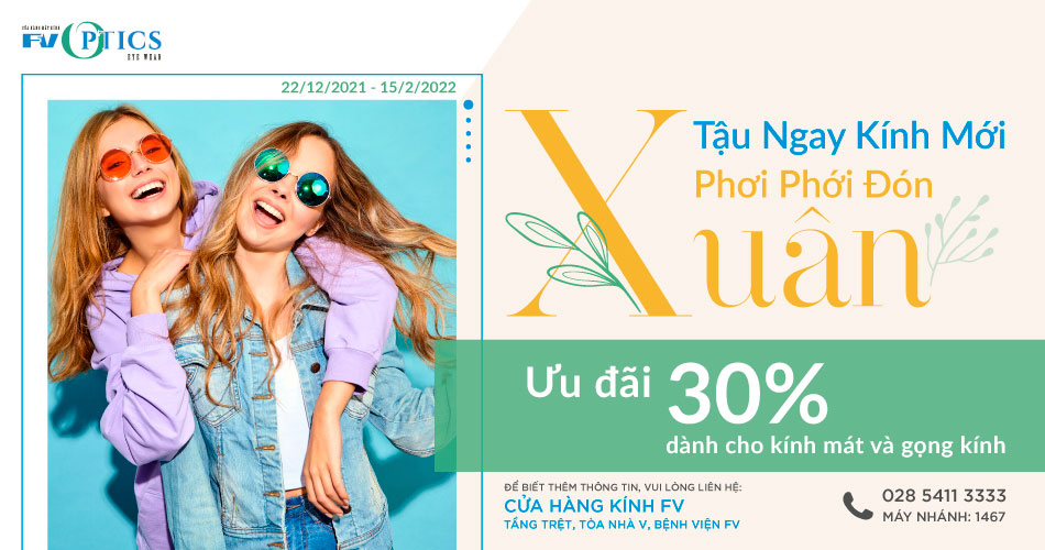 Từ 22/12/2021 đến 15/2/2022, Cửa hàng Mắt kính FV dành tặng ưu đãi 30% cho khách hàng khi đến mua sắm kính mát và gọng kính.