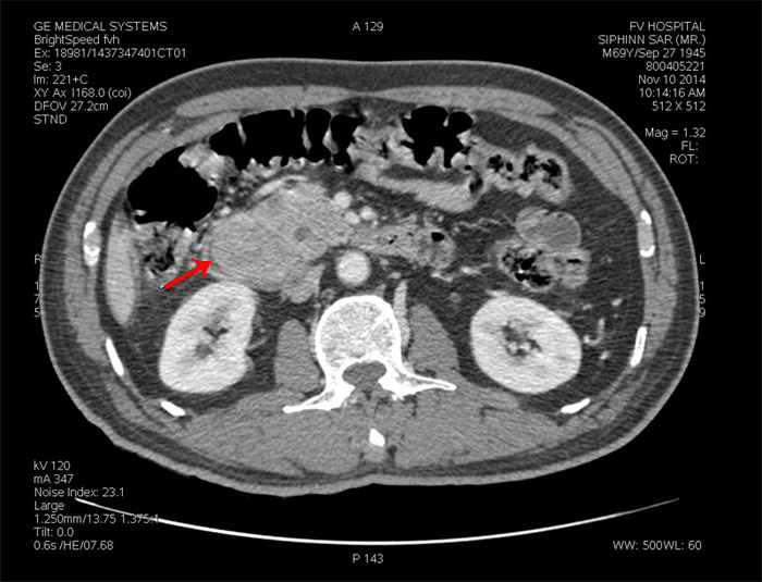 Khối u đầu tụy (dấu mũi tên chỉ) của bệnh nhân D trên film CT scan)