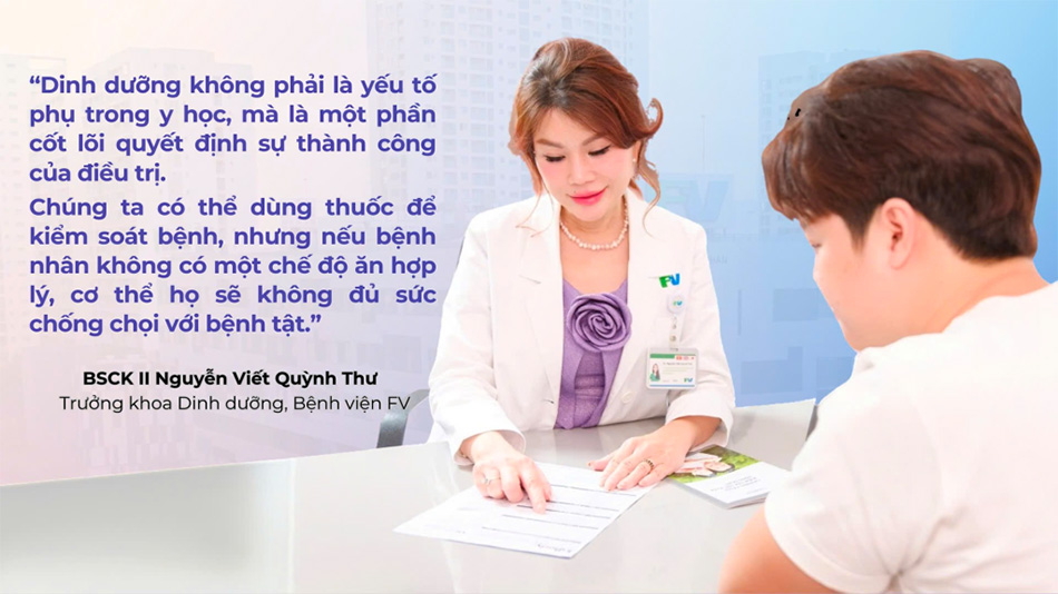 Hơn 20 năm kinh nghiệm trong lĩnh vực dinh dưỡng lâm sàng, bác sĩ Nguyễn Viết Quỳnh Thư khẳng định, dinh dưỡng không chỉ mang tính hỗ trợ mà còn đóng vai trò quyết định quá trình điều trị và ảnh hưởng trực tiếp đến kết quả điều trị. Từ những ca hậu phẫu cần phục hồi nhanh, bệnh nhân ung thư cần duy trì thể trạng, cho đến bệnh nhân tim mạch, tiểu đường cần kiểm soát dinh dưỡng để ổn định đường huyết…, tất cả đều không thể tách rời chế độ ăn uống khoa học.