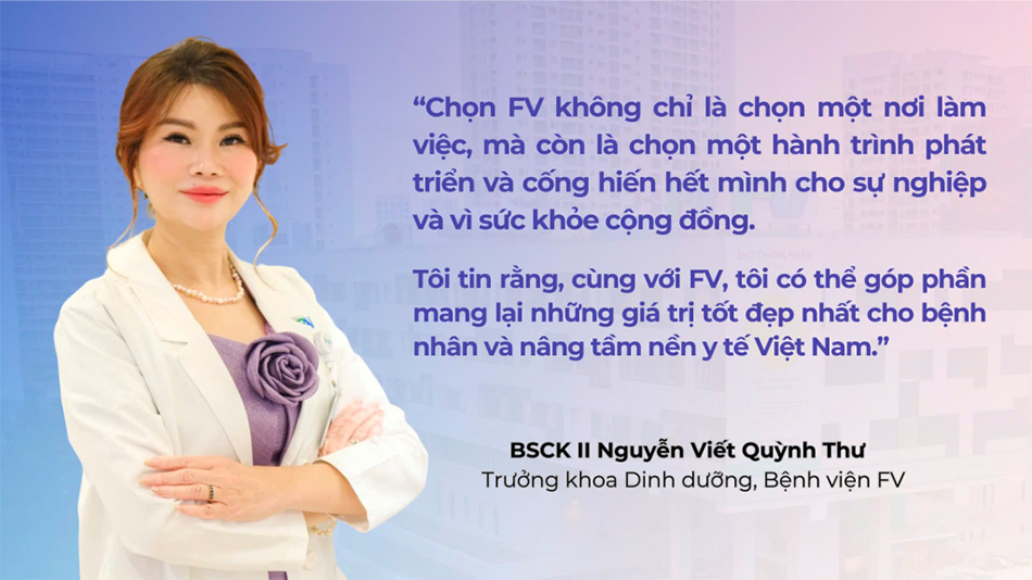 Một trong những điều làm bác sĩ Thư cảm thấy hạnh phúc nhất là sự thay đổi tích cực của bệnh nhân sau khi được tư vấn và điều trị dinh dưỡng. Năm 2017, bác sĩ Nguyễn Viết Quỳnh Thư chọn bệnh viện FV làm bến đỗ mới cho sự nghiệp. Trong thời gian ngắn chị đã phát triển khoa Dinh Dưỡng lên một tầm cao mới.