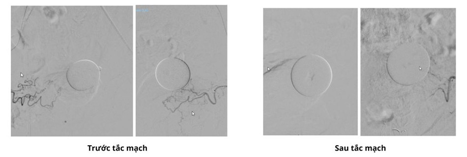 Hình ảnh DSA trước và sau thủ thuật nút mạch. Động mạch tiền liệt tuyến đã được thuyên tắc hoàn toàn