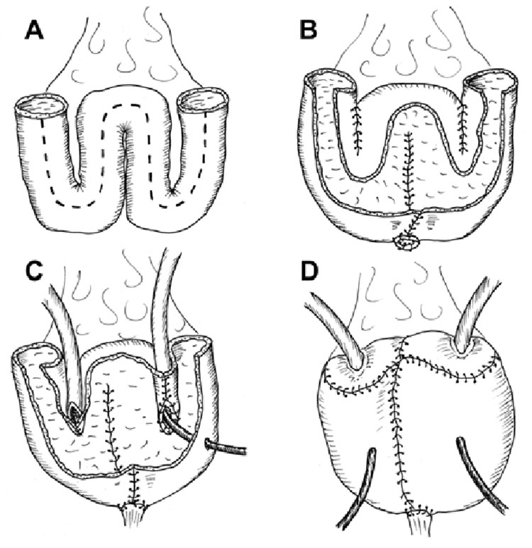 Hình minh họa kỹ thuật tạo hình bàng quang mới: Ruột được cắt ra (A), khâu thành túi (B), nối với hai ống từ thận xuống (C) và nối với 2 ống dẫn nước tiểu (D)