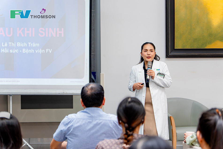 Tiếp nối chương trình, BS. Lê Thị Bích Trâm – Khoa Gây mê Hồi sức FV đã mang đến góc nhìn khoa học và nhân văn về các phương pháp giảm đau khi sinh. Từ gây tê ngoài màng cứng đến các phương pháp hỗ trợ không dùng thuốc, bác sĩ phân tích rõ quy trình an toàn, chỉ định và theo dõi sát sao nhằm đảm bảo lợi ích cho cả mẹ và bé. Thông điệp được nhấn mạnh xuyên suốt: giảm đau đúng cách không làm mất đi trải nghiệm làm mẹ, mà giúp mẹ đủ sức khỏe và tinh thần để đón con chào đời trọn vẹn.