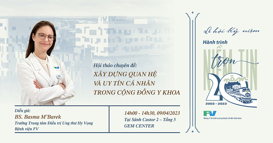 Trong sự kiện lễ hội kỷ niệm FV 20 năm “Hành trình trọn niềm tin – Mang y tế chất lượng quốc tế đến Việt Nam” tổ chức ngày 9/4, bác sĩ Basma M’Barek sẽ có buổi chia sẻ về chủ đề xây dựng và kết nối cộng đồng y khoa mang lại hiệu quả điều trị toàn diện cho bệnh nhân ung thư.