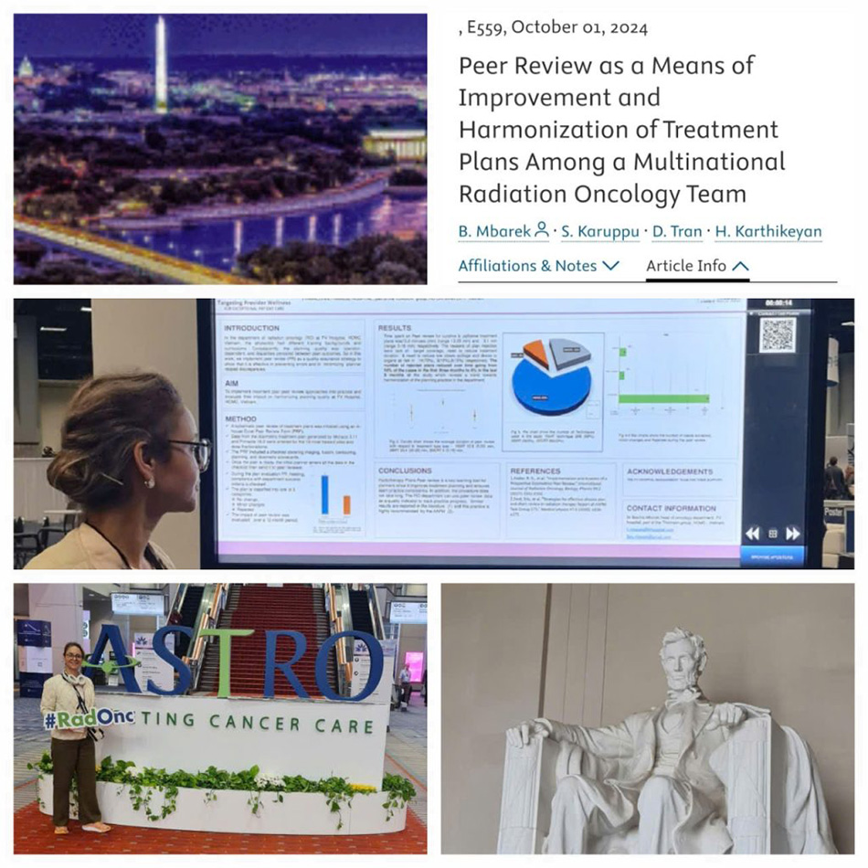 Không dừng lại ở đó, Bác sĩ Basma còn ghi được dấu ấn nổi bật khi một bài thuyết trình poster của cô được chấp thuận tại Hiệp hội Xạ trị Ung thư Hoa Kỳ (ASTRO). Hội nghị ASTRO là một sự kiện khoa học quan trọng và được công nhận trong lĩnh vực xạ trị trên toàn thế giới với hơn 11.000 người tham dự từ hơn 80 quốc gia. Bài thuyết trình với chủ đề “Bình duyệt nội bộ (Peer review) như một phương pháp cải thiện và đồng bộ hóa các kế hoạch điều trị trong một đội ngũ xạ trị ung thư đa quốc gia” tập trung vào việc nâng cao chất lượng điều trị qua phương pháp bình duyệt. “Tôi cảm thấy rất vinh dự vì đã đại diện không chỉ cho Bệnh viện FV tại sự kiện nổi bật này, mà còn cho cộng đồng bác sĩ xạ trị tại Việt Nam”, bác sĩ Basma chia sẻ.Tại Bệnh viện FV, đặc biệt là trong khoa xạ trị ung thư, bác sĩ Basma nhận thấy sự đa dạng trong nền tảng đào tạo của các nhà vật lý, điều này dẫn đến sự khác biệt trong việc lập kế hoạch điều trị. Bình duyệt  nội bộ không chỉ là một công cụ hữu ích để giảm thiểu sai sót mà còn giúp đồng bộ hóa chất lượng điều trị giữa các cá nhân trong một đội ngũ quốc tế.